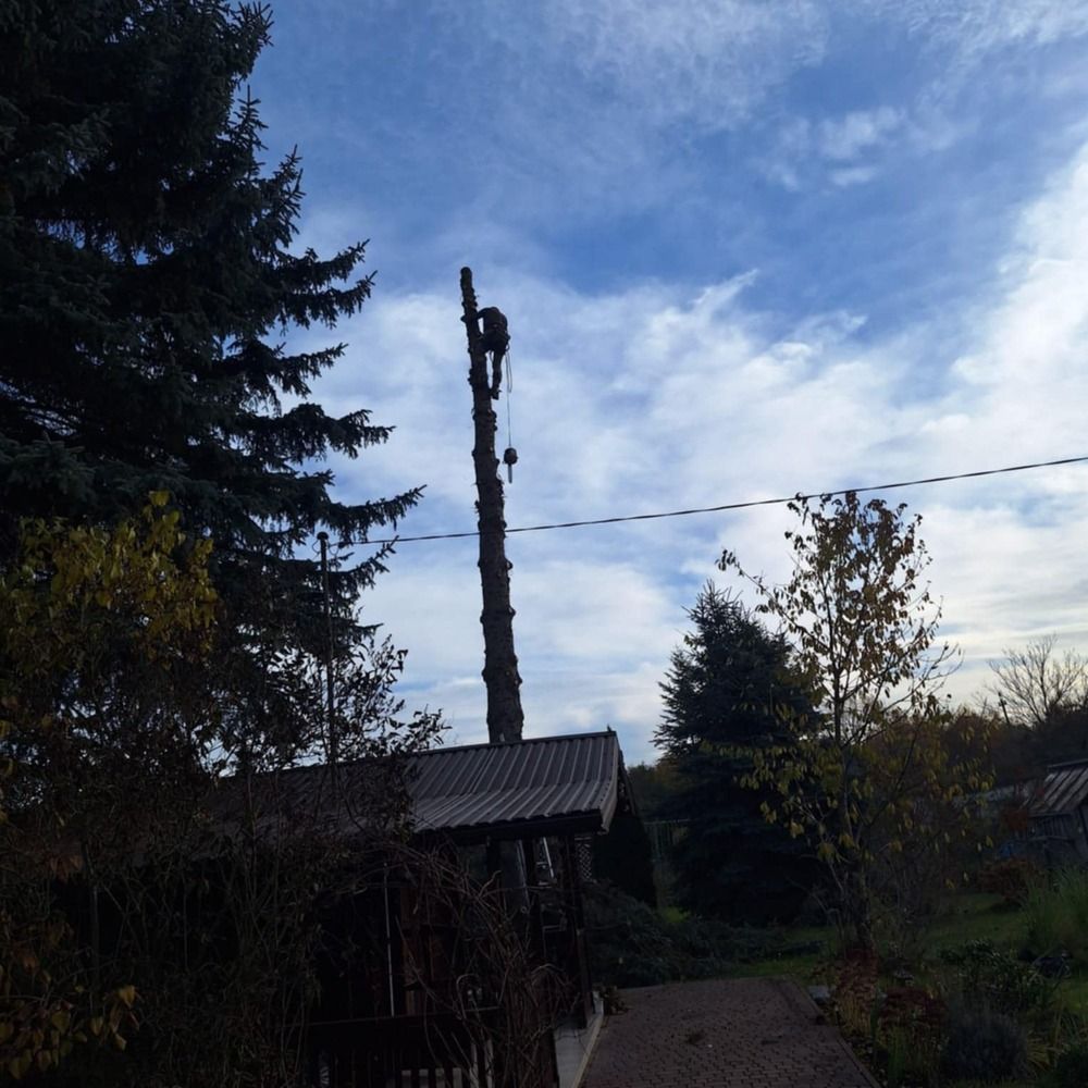 Bezpieczne usuwanie drzew, również tych trudnych i rosnących blisko budynków. Stosujemy metody alpinistyczne.